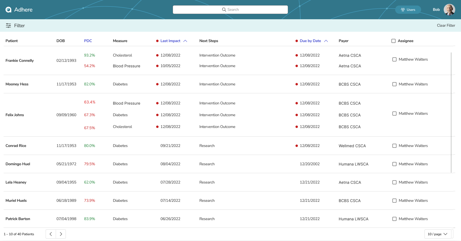 Our Adhere pharmacy teams' primary responsibilities are to ensure a 5 star rating across the board on the chronic condtions we monitor by working with patients from many payers to ensure their patient populations stay adherent to their medication. What we discovered as primary challenges for the team were speed and efficiency coupled with too many opportunities for errors. The key to the patient list is organization with sorting and filtering of key data points, such as PDC. This lets a pharmacy team member scrub through all the data to figure out how to prioritize and quickly work patients.